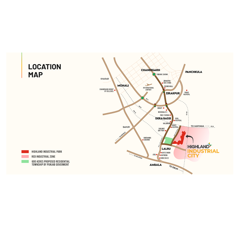 Highland Industrial City is located at Lalru-Mianpur Road, Tohffapur, Lalru, Punjab 140506, marketed by Subhash Mangat & Group. The development boasts proposed amenities like a Weighing Bridge, STP, Dispensary, and Daily Convenience Stores. It also offers support for construction and government liasoning.